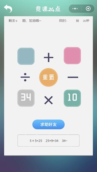 輕松益智類游戲,游戲要求玩家使用系統(tǒng)給出的4個數(shù)字,與四個計算符號(+、-、×、÷),在每個數(shù)字只可使用一次的情況下,通過2次計算得出最終結(jié)果24小程序類別:游戲開發(fā)者:杭州福云掃碼體驗小程序