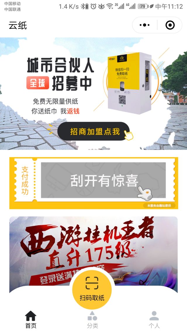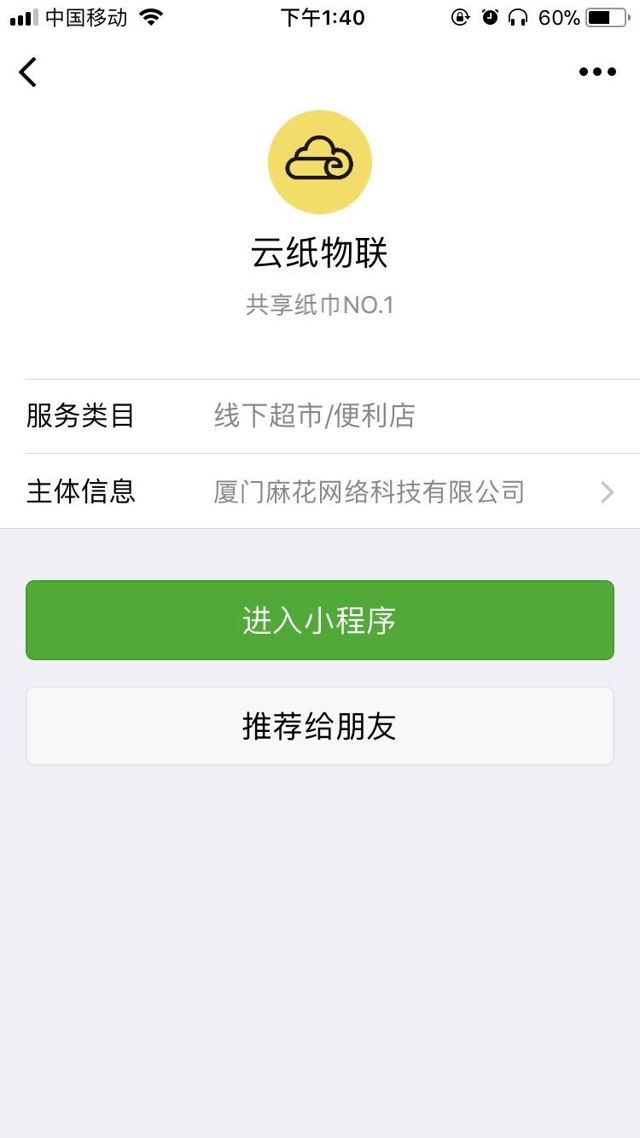 共享紙巾NO.1小程序類別:生活服務開發者:廈門麻花網絡科技有限公司掃碼體驗小程序