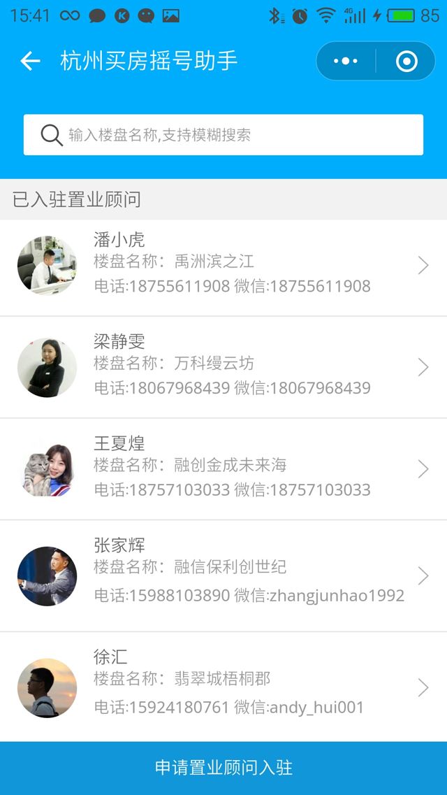 掃碼體驗小程序杭州買房搖號助手提供杭州搖號結果查詢、置業顧問查詢、樓盤預售公示查詢、即將預售樓盤查詢、即將搖號樓盤查詢、登記樓盤查詢,搖號命中率查詢等!買房快人一步小程序類別:內容資訊開發者:成都永波服飾有限公司小程序截圖