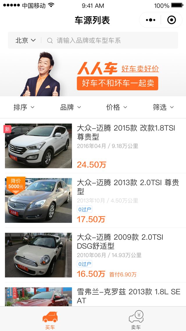 掃碼體驗小程序人人車黃渤推薦的靠譜、劃算、放心的二手車交易平臺,為您提供1年或2萬公里質保,249項專業檢測,14天可退服務。小程序類別:汽車開發者:公司小程序截圖