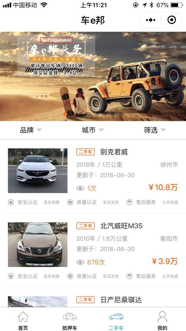 掃碼體驗小程序車e邦平臺專為足不出戶的用戶提供全方位的汽車服務項目。查違章、購買汽車配件、上保險等,快來使用車e邦,盡享優質服務。小程序類別:汽車小程序截圖