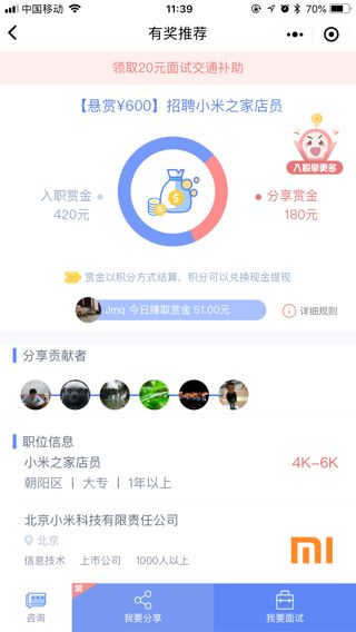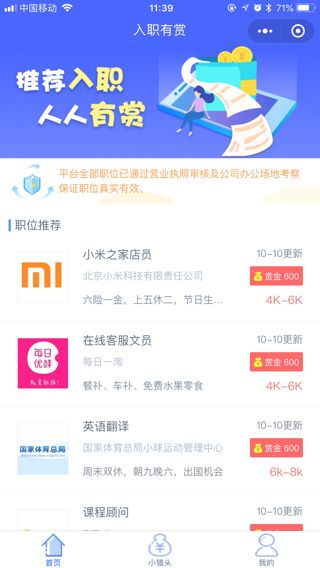 掃碼體驗小程序入職有賞是一款懸賞招聘小程序,通過微信的好友資源快速傳播職位信息,精準(zhǔn)的獲取合適的候選人,成功入職您和好友都可以獲得相應(yīng)的賞金,每個參與分享、傳播的貢獻者也都可以獲得一定的分享賞金小程序類別:生活服務(wù)開發(fā)者:北京位來小獵科技有限公司小程序截圖