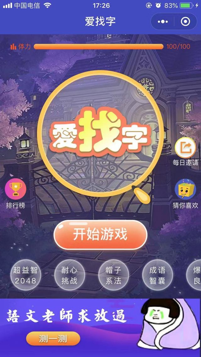 愛找字,找茬游戲新玩法,挑戰漢字極限,看看你的眼神還行嗎!小程序類別:游戲開發者:衡信網絡小程序截圖