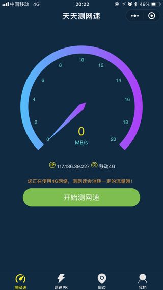 掃碼體驗小程序天天測網速天天測網速提供精準的2G、3G、4G網速測試與WIFI網速測試,可將網速測試結果分享給好友邀請參與網速PK,可顯示當前測試的網絡IP信息、運營商信息等,還可查看周邊位置其他人的網速,是一個可以玩起來的網速測試工具。小程序類別:工具開發者:深圳市蓓霖貿易有限公司小程序截圖