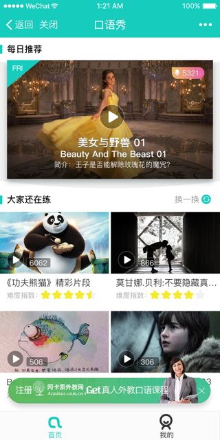 掃碼體驗小程序天天口語秀英語口語練習小程序類別:教育開發者:阿卡索外教網小程序截圖
