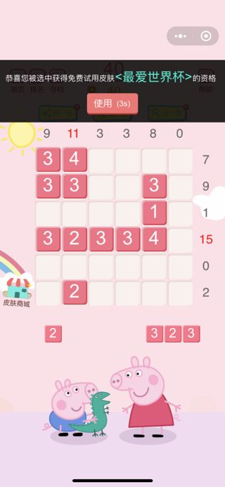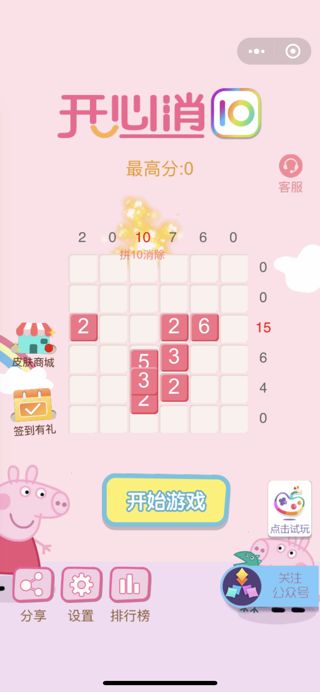 掃碼體驗小程序開心消10開心消10是一款益智類消除游戲,需要將隨機方塊組合拖拽進棋盤內(nèi),橫或豎所有數(shù)字相加正好等于10時,消除相應方塊并得分。小程序類別:游戲開發(fā)者:個人小程序截圖