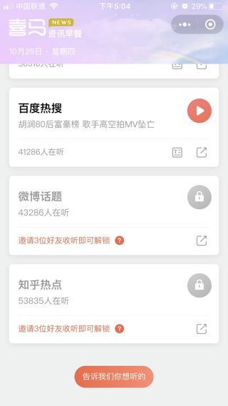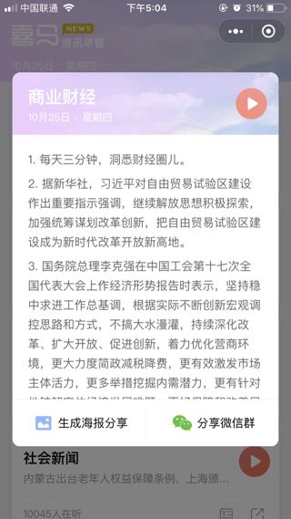 掃碼體驗小程序喜馬資訊早餐喜馬資訊早餐是喜馬拉雅FM官方出品的一款熱點資訊小程序。在這里可以第一時間收聽最新鮮熱門的資訊;可以關注你感興趣的資訊內容;更有微博,百度,知乎的特色專欄,讓你輕松一鍵聽。每天三分鐘,知曉天下事!小程序類別:內容資訊開發者:上海證大喜馬拉雅網絡科技有限公司小程序截圖