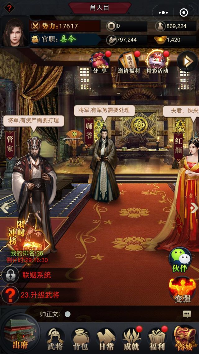 掃碼體驗小程序《風流霸業》是一款三國題材策略類經營養成游戲小程序類別:游戲開發者:北京昊宇上游信息科技有限公司小程序截圖