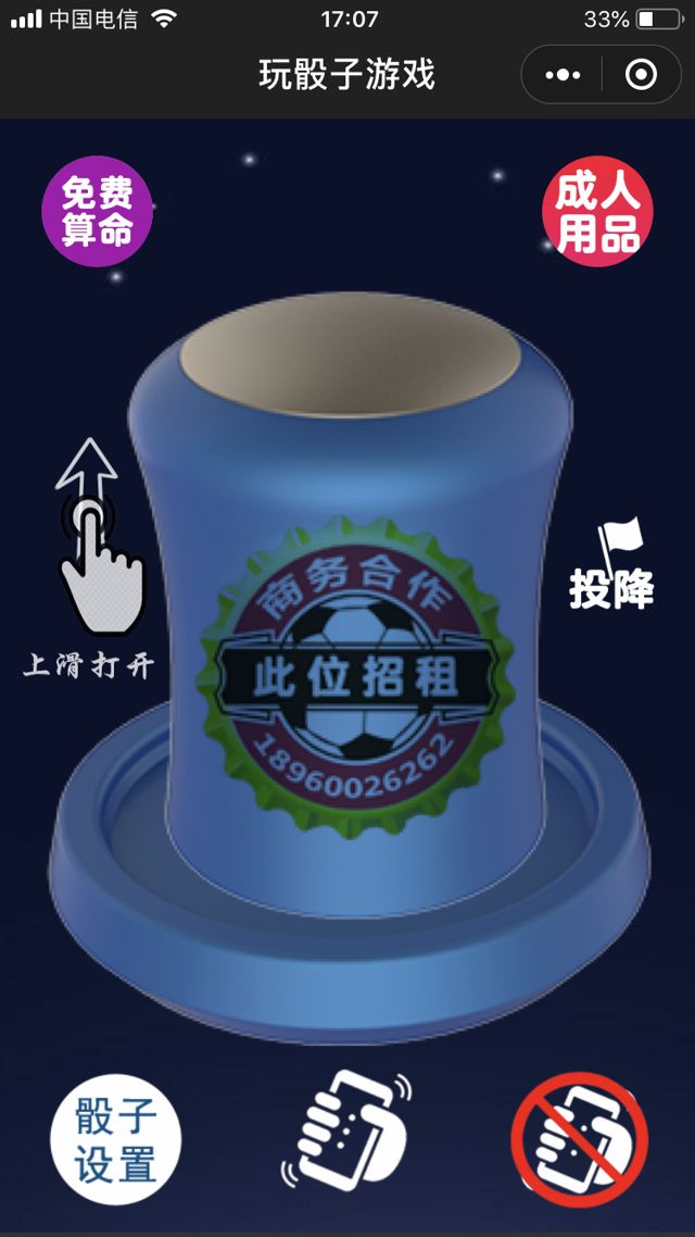 掃碼體驗小程序玩骰子游戲就用微篩子喝酒搖骰子專用搖骰子喝酒游戲小程序類別:工具開發者:漳州士心網絡科技有限公司小程序截圖
