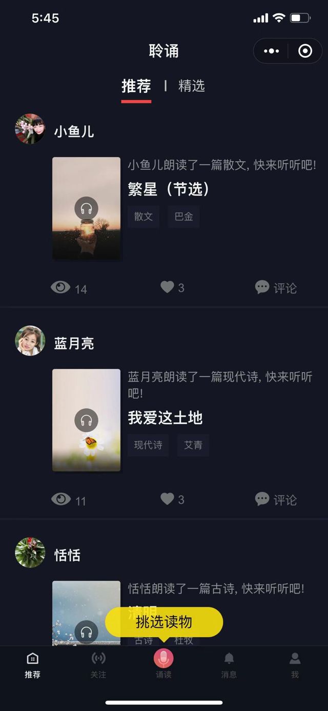 掃碼體驗小程序聆誦是一款為朗誦愛好者設計的配樂朗誦平臺,不僅可以錄制聲音,配上好聽的音樂,還可以挑選精美的動畫背景哦~快來朗讀吧!分類:圖片攝影標簽:朗誦 朗讀 誦讀 詩歌 朗誦小程序截圖