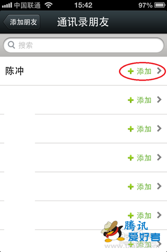 系統就會自動的搜索喜愛能過關的用戶,所有手機通訊錄的聯系裂解都會出現,而選擇想要添加的好友,然后直接點擊聯系人右邊的添加按鈕,就可以看到要添加的好友的詳細資料。確認沒有任何錯誤之后,點擊添加到通訊錄。