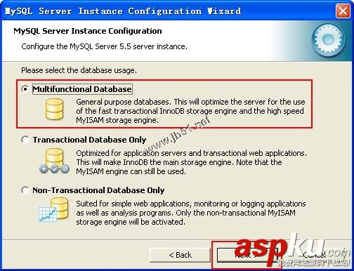 4、單擊Next按鈕,進(jìn)入選擇數(shù)據(jù)庫(kù)用途對(duì)話框,在該對(duì)話框中有3個(gè)選項(xiàng),一般選擇默認(rèn)的第一個(gè)單選按鈕,即多功能數(shù)據(jù)庫(kù),如圖所示: