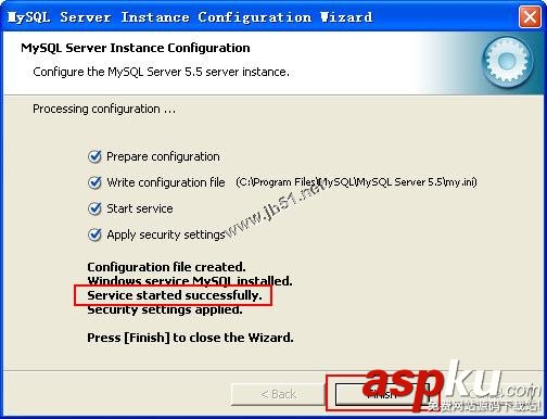 12、如果對(duì)設(shè)置準(zhǔn)確無(wú)誤,單擊Execute按鈕,MySQL Server配置向?qū)?zhí)行一系列的任務(wù),并在對(duì)話框中顯示任務(wù)進(jìn)度,執(zhí)行完畢之后顯示如圖所示:?jiǎn)螕鬎inish按鈕完成整個(gè)配置過(guò)程。