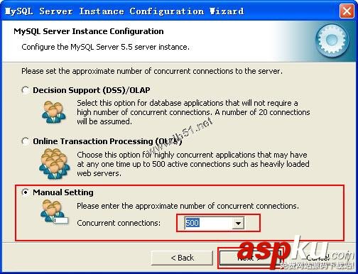 6、單擊Next按鈕,進(jìn)入設(shè)置服務(wù)器最大并發(fā)連接數(shù)對(duì)話框中,該對(duì)話框中提供了3種不同的連接選項(xiàng),我覺(jué)的還是手動(dòng)設(shè)置比較好,在這里我將連接數(shù)改為500,如圖所示: