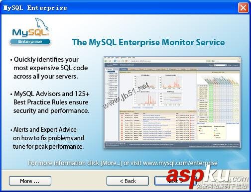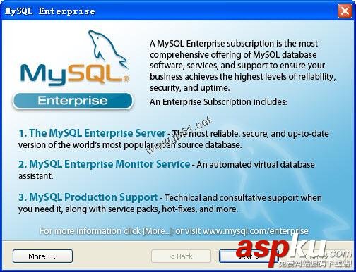9、安裝完成后,將彈出有關(guān)MySQL Enterprise版本的介紹說(shuō)明對(duì)話框,單擊【More】按鈕,如圖所示: