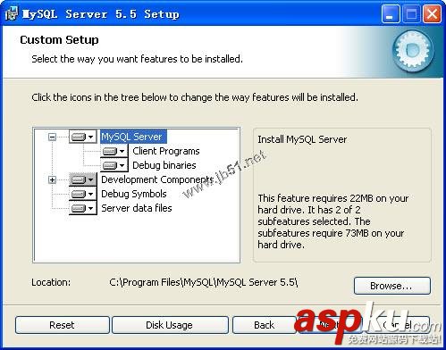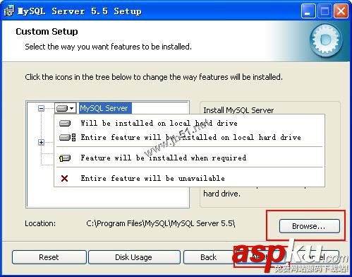 6、默認(rèn)情況下,選擇全部安裝,要想更改組件,單擊該組件的圖標(biāo)并從下拉列表中選擇新的選項(xiàng),并設(shè)置安裝路徑,單擊Next按鈕,如圖所示: