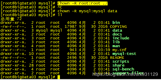安裝完之后修改當前目錄擁有者為root用戶,修改data目錄擁有者為mysql