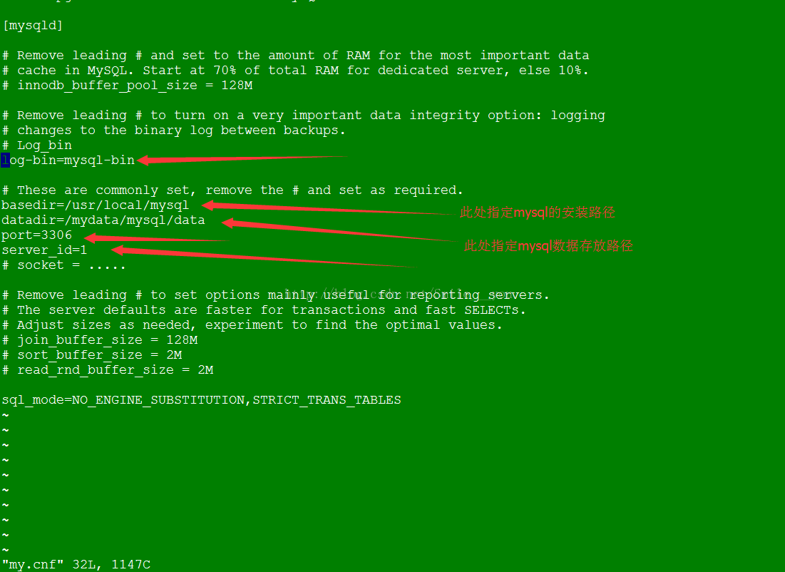 5.編輯my.cnf,指定mysql安裝路徑和mysql數據文件存放路徑,下圖還配置了bin-log,配置bin-log的同時需要指定server_id