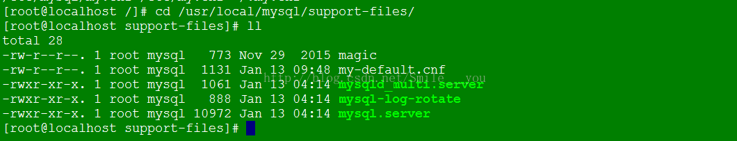 如上圖所示,我們首先切換到mysql安裝目錄的support-files目錄下面,通過ll命令查看下面的文件信息