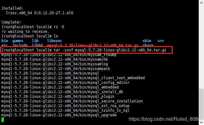 1.2 將導入的Mysql壓縮包進行解壓,輸入:tar -zxvf mysql-5.7.28-linux-glibc2.12-x86_64.tar.gz命令