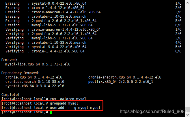 輸入:rpm -qa|grep mysql命令再進行查看 什么也不顯示表示已經刪除。