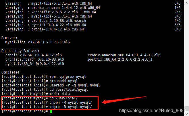 cd /usr/local/chown -R mysql mysql/chgrp -R mysql mysql/