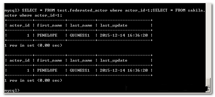 USE test;update federated_actorset last_name='GUINESS1'where actor_id=1;SELECT * FROM test.federated_actor;SELECT * FROM sakila.actor;