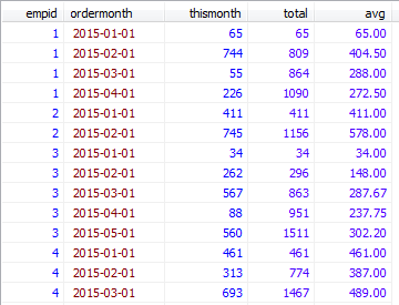 SELECT a.empid, a.ordermonth,a.qty AS thismonth, SUM(b.qty) AS total, CAST(AVG(b.qty) AS DECIMAL(5,2)) AS avgFROM emporders aINNER JOIN emporders b ON a.empid=b.empid AND b.ordermonth <= a.ordermonthGROUP BY a.empid,a.ordermonth,a.qtyORDER BY a.empid,a.ordermonth