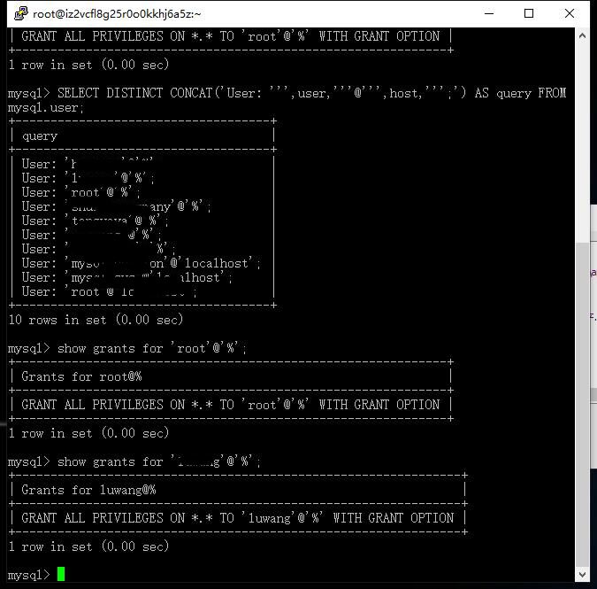 SELECT DISTINCT CONCAT('User: ''',user,'''@''',host,''';') AS query FROM mysql.user;查看具體用戶的權(quán)限:
