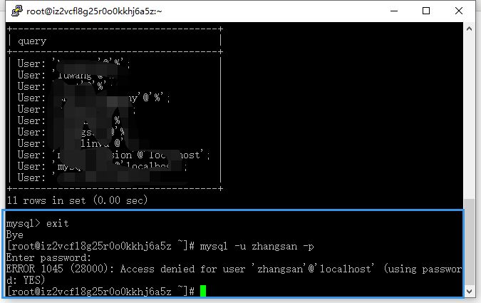 輸入exit,退出MySQL,然后試著用zhangsan這個賬戶登錄一下。