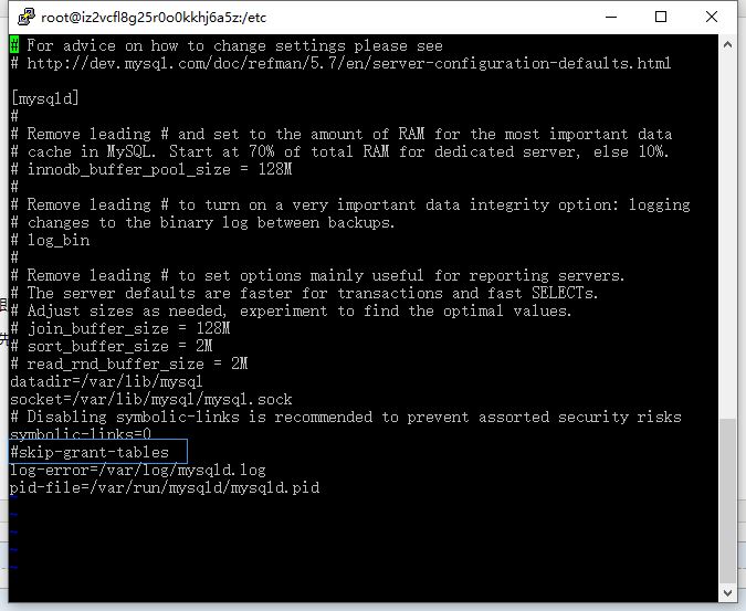 打開文件后(vi my.cnf),進入編輯模式(a)找到mysqld關(guān)鍵字,在mysqld下面添加skip-grant-tables,保存退出(先esc,再:wq),如圖: