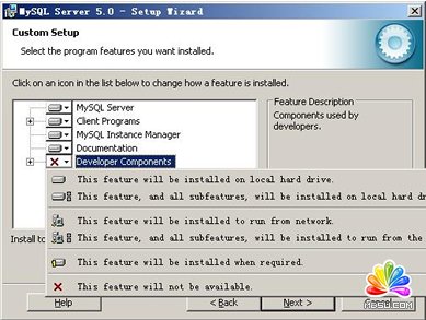 在“Developer Components(開發者部分)”上左鍵單擊,選擇“This feature, and all subfeatures, will be installed on local hard drive.”,即“此部分,及下屬子部分內容,全部安裝在本地硬盤上”。在上面的“MySQL Server(mysql服務器)”、“Client Programs(mysql客戶端程序)”、“Documentation(文檔)”也如此操作,以保證安裝所有文件。點選“Change...”,手動指定安裝目錄。