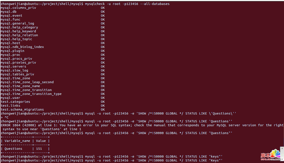 mysql -u root -p123456 -e 'SHOW /*!50000 GLOBAL */ STATUS LIKE "Questions"'