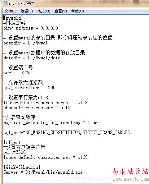 [mysqld]#綁定IPv4bind-address = 0.0.0.0 # 設置mysql的安裝目錄,即你解壓縮安裝包的位置basedir = D:/Mysql # 設置mysql數據庫的數據的存放目錄datadir = D:/Mysql/data # 設置端口號port = 3306 # 允許最大連接數max_connections = 200 # 設置字符集為utf8loose-default-character-set = utf8character-set-server = utf8 #開啟查詢緩存explicit_defaults_for_timestamp = true sql_mode=NO_ENGINE_SUBSTITUTION,STRICT_TRANS_TABLES [client] #設置客戶端字符集port=3306loose-default-character-set = utf8 [WinMySQLadmin] Server = D:/Mysql/bin/mysqld.exe