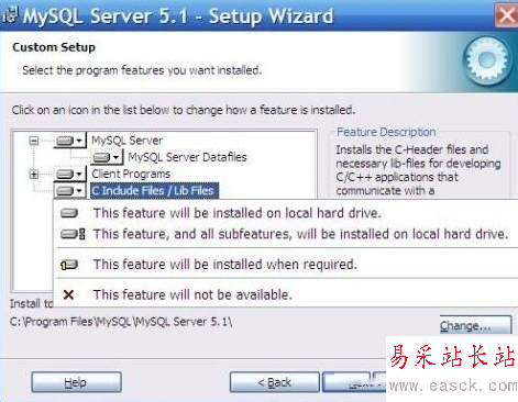 在“Mysql server(MySQL服務器)”上左鍵單擊,選擇“This feature, and all subfeatures, will be installed on local hard drive.”,即“此部分,及下屬子部分內容,全部安裝在本地硬盤上”。點選“Change…”,手動指定安裝目錄。