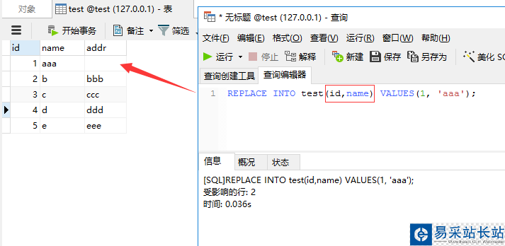 這里我們只指定id,name字段,我們來(lái)看看replace into后addr字段內(nèi)容是否還存在