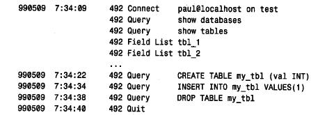 下面是一個實例,它是作為一個短客戶機會話的結果出現在常規日志中的信息中的,這個會話在test 數據庫中創建一個表,并插入一行到該表中,然后刪除該表: