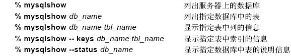 mysqlshow 命令提供了某些與show 語句相同的信息,它允許從外殼程序中取得數據庫和表的信息: