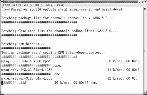 雖然已經成功,但是我還是不覺得輕松,畢竟這個方法過于復雜。于是,我開始尋求更簡單的解決辦法。工夫不負有心人,最后,我終于找到了解決的辦法,也就是我將要給大家介紹的方法二。 安裝配置方法二 這種方法的基本思想是,通過rhn讓red hat自己進行軟件更新和依賴性的檢查,至于如何設置rhn,請參考本刊2003年第1期“使用rhn讓red hat linux自動更新”的文章。 在red hat 8.0中,安裝的步驟如下: 第一步 up2date mysql mysql-server and mysql-devel 如果網速足夠快,那么這個步驟也不會花太多的時間。在我的機器上,這個過程只花費了4分鐘,如圖3所示。