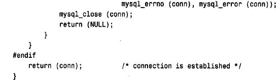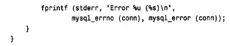 ■ 如果數據庫名稱是非null 的,則do_connect() 調用mysql_select_db() 使指定的數據庫為當前數據庫(這類似于沒有db_name 參數的效果)。如果沒有選擇這個數據庫,則do_connect() 打印一個錯誤消息,關閉連接,并返回null 來表示失敗。