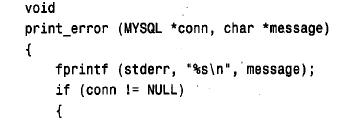 ■ 樣例2 該樣例是在對第一個樣例的do_connect() 做更改的基礎上建立的。那些更改導致對錯誤函數mysql_errno() 和mysql_error() 的三組調用。每次都將報告問題的這些代碼書寫出來是非常討厭的。除此之外,錯誤所打印出的代碼看起來不舒服,讀起