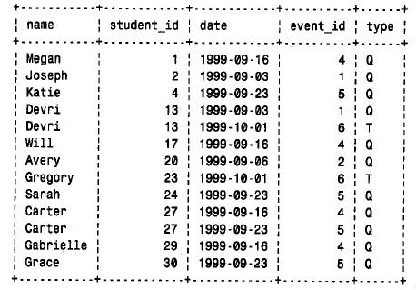 可利用order by 子句對結果進行排序。兩種最合理的排序分別是按學生和按事件進行,我們選擇第一種: