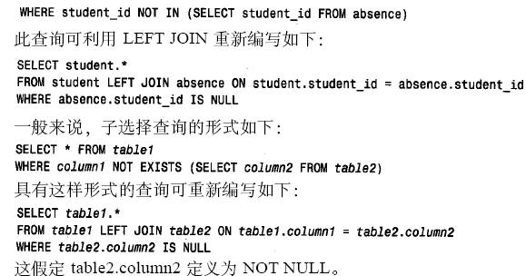 mysql自3.24版本以來才具有子選擇功能。這項功能的缺少是mysql中一件常常令人惋惜的事,但有一件事很多人似乎沒有認識到,那就是用子選擇編寫的查詢通常可以用連接來編寫。實事上,即使mysql具有了子查詢,檢查用子選擇編寫的查詢也是一件苦差事;用連接而不是用子選擇來編寫會更為有效。
