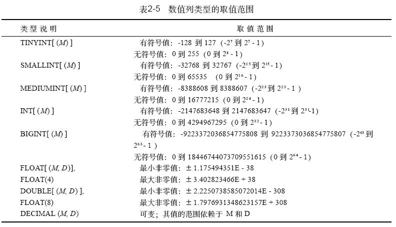 以賦予浮點列,這時將它們表示為小數部分為零的浮點值。每種數值類型的名稱和取值范圍如表2 - 5所示。各種類型值所需的存儲量如表2-6 所示。