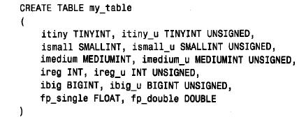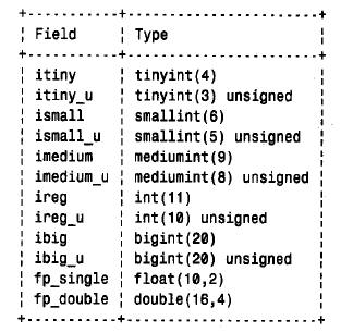 如果在創建表之后使用describe my_table 語句,則輸出的field 和type 列如下所示(注意,如果用mysql的3.23 以前的版本運行這個查詢,則有一個小故障, 即bigint 的顯示寬度將是21而不是2 0。):