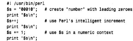 perl’s‘+ +’自動增量操作是很靈巧的而且可以利用串或數值建立序列值,但‘+ =’操作只應用于數值。在所顯示的輸出中,可看到‘ + =’引起串到數值的轉換并且丟失了$s 值中的前導零。