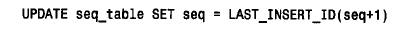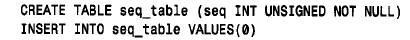 上面的語句創建了表seq_table 并用包含seq 值0 的行對其進行初始化。可利用這個表產生下一個序列號,如下所示: