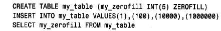 可對所有數值類型指定zerofill 屬性。它使相應列的顯示值用前導零來填充,以達到顯示寬度。在希望確定列值總是以給定的數字位數顯示時可利用z e r o f i l l。實際上,更準確地說是“一個給定的最小數目的數字位數”,因為比顯示寬度更寬的值可完全顯示而未被剪裁。使用下列語句可看到這一點: