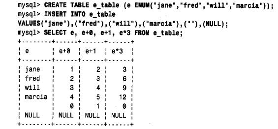 enum 和set 被歸為串類型是由于在建立這些類型的列時,枚舉和集合成員被指定為串。但是,這些成員在內部存放時作為數值,而且同樣可作為數值來處理。這表示enum 和s e t類型比其他的串類型更為有效,因為通常可用數值運算而不是串運算來處理它們。而且這還表示enum 和set 值可用在串或數值的環境中。