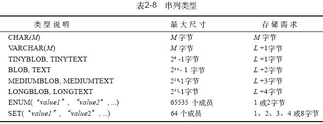 表2 - 8給出了mysql定義串值列的類型,以及每種類型的最大尺寸和存儲需求。對于可變長的列類型,各行的值所占的存儲量是不同的,這取決于實際存放在列中的值的長度。這個長度在表中用l 表示。